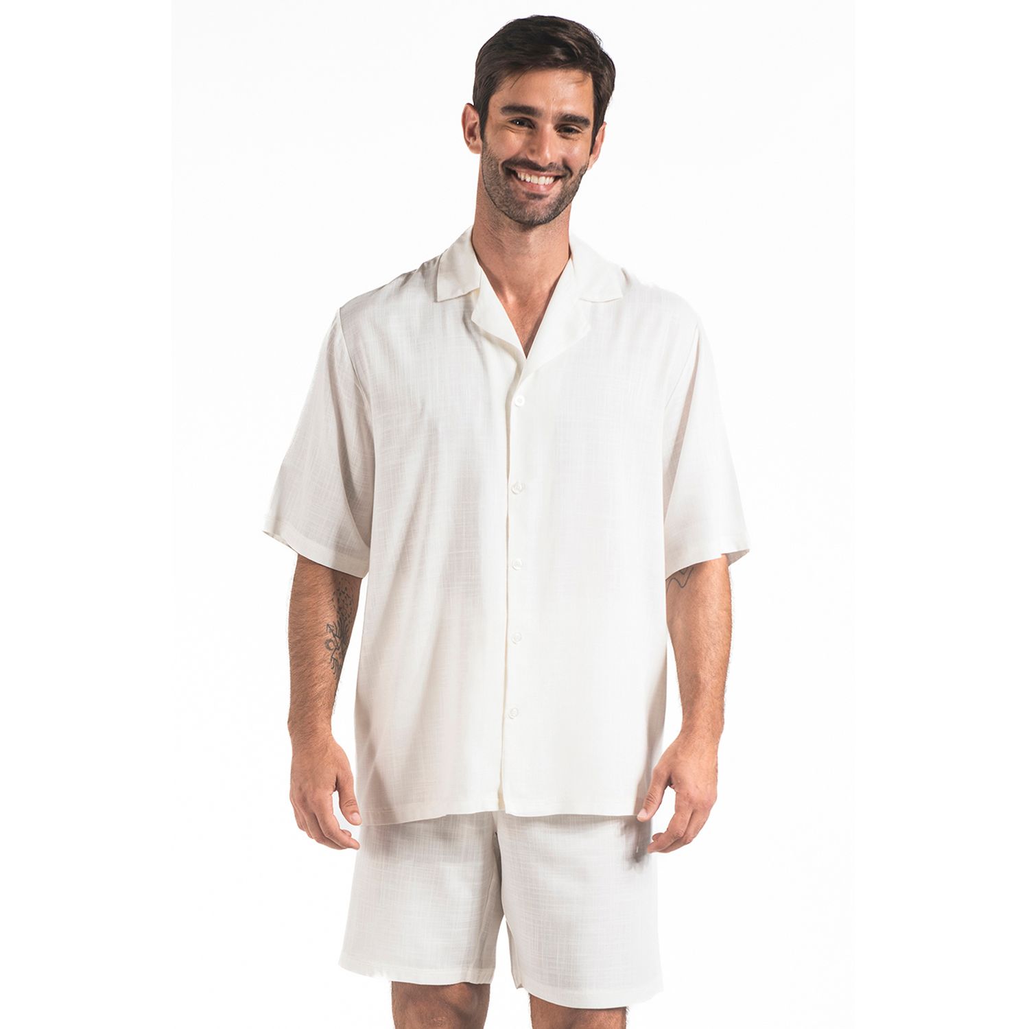 Confeccionado em 100% viscose, oferece frescor, caimento fluido e sensação de leveza ao vestir. A camiseta conta com abertura frontal por botões e modelagem confortável. Enquanto o short, sem bolsos e com cós em elástico, garante liberdade de movimento com ajuste ideal.