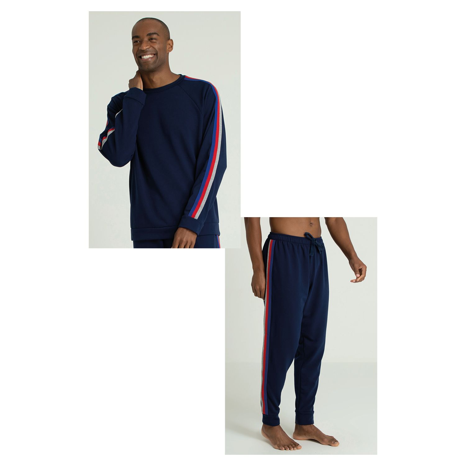 A calça de moletom, também confeccionada em 64% poliéster, 34% viscose e 2% elastano, conta com corte esportivo, listra lateral combinando com a blusa, elástico e cordão no cós e punhos ajustados, além de não possuir bolsos.