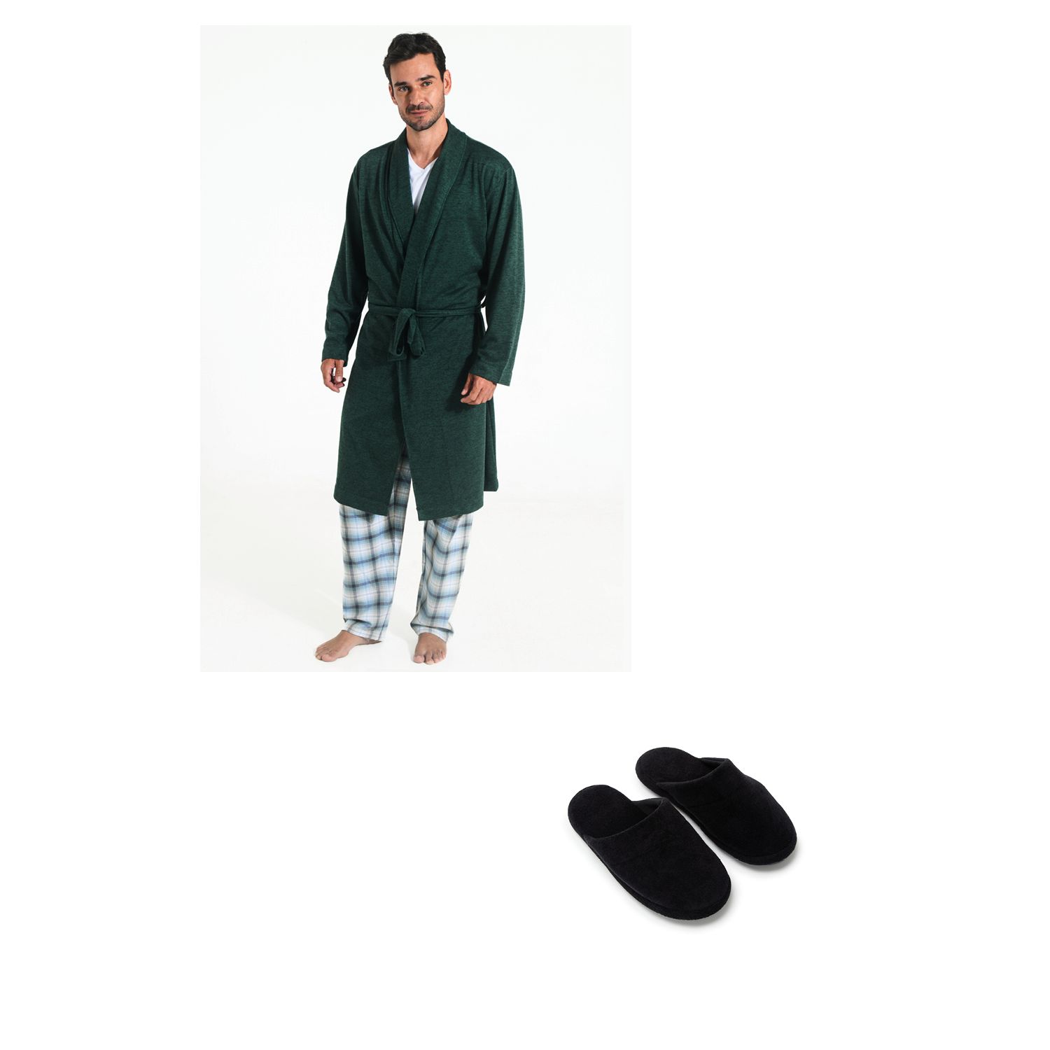 O robe masculino é confeccionado em 96% poliéster e 4% elastano, com malha que imita o visual de um tricô leve. Sem bolsos, ele possui mangas longas e cordão na cintura, garantindo ajuste perfeito e sensação acolhedora em todas as estações.
